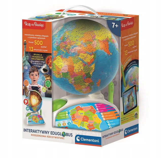 Clementoni Exploring the Augmented Reality World to interaktywny globus, który pozwala odkrywać piękno świata i rozwiązywać zabawne łamigłówki. Aby rozpocząć podróż wiedzy, dziecko musi skierować optyczny długopis na mapę świata, aby uzyskać wszystkie informacje o wybranym miejscu.
