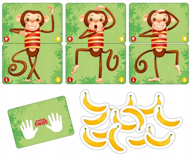 Zabawa polega na odwzorowaniu pozy małpki z wylosowanych dwóch kart. Komu się to uda, utrzyma równowagę i nie pomyli się – ten dostanie banana! Gra posiada kilka wariantów, które sprawdzą się zarówno podczas samodzielnej zabawy, jak i w dużej grupie.