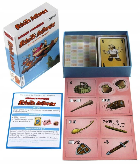 Bohaterowie komiksów „Kajko i Kokosz” znani są już dwóm pokoleniom Polaków. Ich przygody czytane są zarówno przez dzieci, jak i rodziców. Gra karciana „Kajko i Kokosz – Szkoła latania” nawiązuje do tej najpopularniejszej polskiej serii komiksowej. Zasady karcianki są niezwykle proste. Zagraj karty, wykorzystaj siłę swoich postaci i pokonaj rywali! Wygra gracz, który na koniec gry będzie mieć najmniej punktów karnych. Gra ma dwa warianty zasad, dzięki czemu świetnie sprawdzi się zarówno w gronie 7-latkow, jak i starszych graczy. „Szkoła latania” w wersji karcianej dostarczy wiele frajdy nie tylko fanom komiksu.