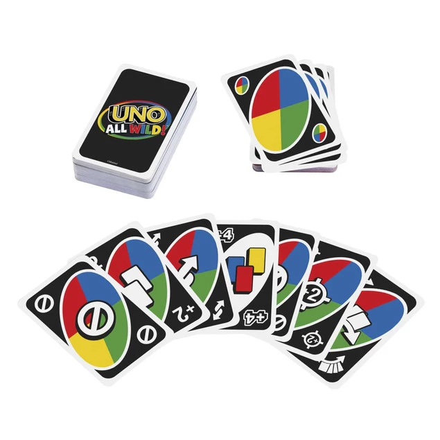 W talii UNO All Wild znajdują się unikalne dzikie karty specjalne, takie jak „Zmiana kierunku”, „Postój”, „Postój dla dwóch”, „Weź dwie”, „Weź cztery”, a także nowości: „Wymuszona zmiana” i „Ty weź dwie”. Te efekty wprowadzają dodatkowe zwroty akcji, podnosząc poziom emocji i strategii podczas gry.