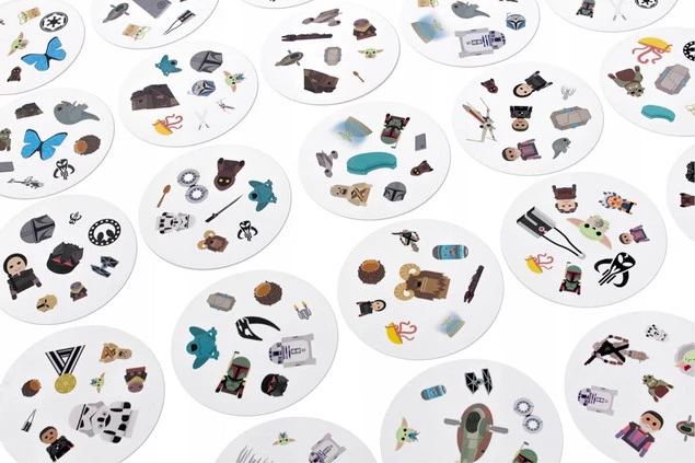 Zabierz bohaterów takich jak Mandalorian, Grogu, Ahsoka Tano czy Kuiil gdzie tylko zechcesz i baw się, szukając par w popularnej grze towarzyskiej! Spójrz na pierwszą kartę, którą trzymasz w ręku oraz na tę, która leży na środku stołu. Znajdź na nich wspólny obrazek, nazwij go i szybko pozbądź się swojej karty. Teraz następna! Tylko nie zwątp, dwie karty zawsze łączą się dokładnie jednym symbolem!