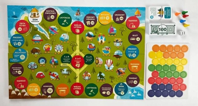 - Zawartość: plansza, 42 karty, 100 banknotów, 40 żetonów w 5 kolorach, pionki i kostka