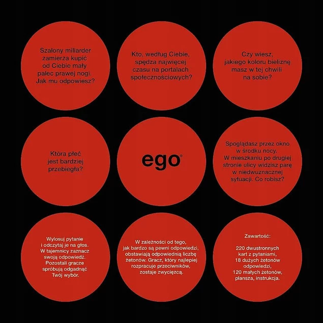 Ego to kultowa gra towarzyska, która z pewnością stanie się atrakcją niejednej imprezy. Zabawa polega na trafnym odpowiadaniu na niebanalne pytania na temat naszych znajomych, rodziny, przyjaciół.