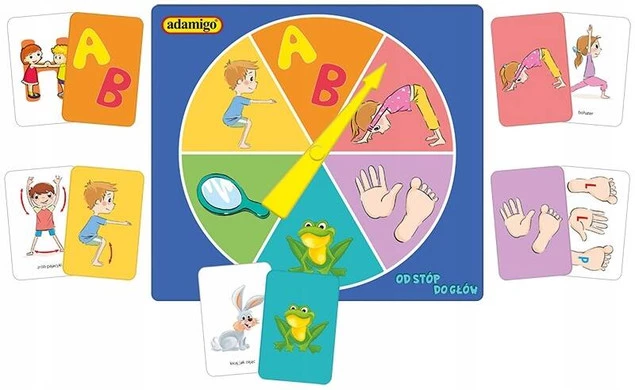 Od stóp do głów to pełna wyzwań rozrywka ruchowa dla wszystkich. Wystarczy zakręcić strzałką na tarczy i wybrać odpowiednią kartę z zadaniem. Zestaw świetnie sprawdzi się w domu i przedszkolu!