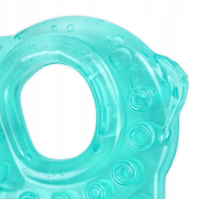 Wykonany z bezpiecznych materiałów nie zawierających żadnych szkodliwych substancji.  Różne faktury gryzaczka pomagają masować dziąsła a przy okazji też pobudzają zmysły maluszka  Wypustki umieszczone mają za zadanie dodatkowo masować obolałe i napuchnięte dziąsła. Ergonomiczny kształt i duży otwór pośrodku gryzaczka  znacznie ułatwia chwytanie gryzaka malutkimi rączkami dziecka. Dodatkowo gryzak wypełniony został wodą - po włożeniu na chwilę do lodówki gryzaczek staje się swoistym zimnym okładem i przynosi dziecku znaczącą ulgę.