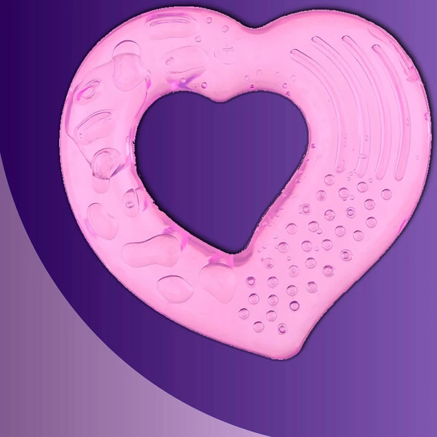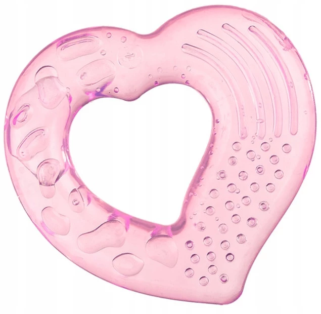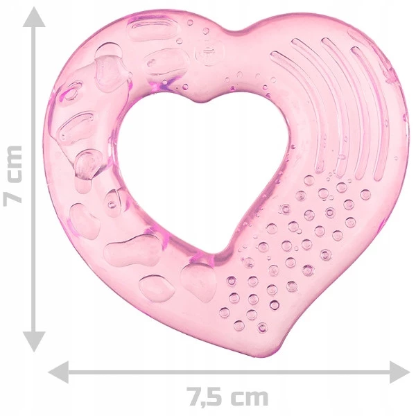 Gryzaczek w kształcie różowego serduszka wypełniony chłodną destylowaną wodą. Posiada on wypustki, które przyniosą ulgę podrażnionym dziąsłom niemowlaka. a dzięki dużemu otworowi pośrodku jest wygodny do chwytania przez małe rączki.