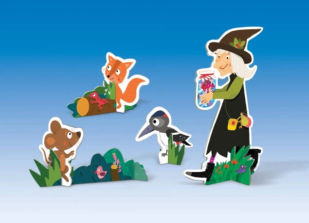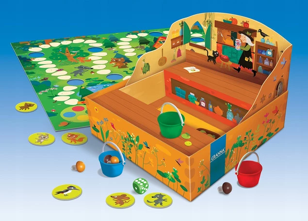 Piękna, bajkowa oprawa 3D – przestrzenna chatka czarownicy, leśne ścieżki, koszyczki na grzybki i kolorowe pionki zachęcają do grania i rozwijają wyobraźnię dziecka.