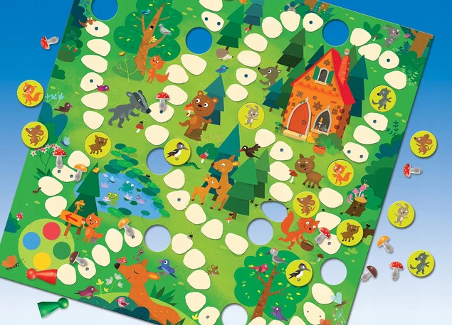 poruszają pionkami po leśnej planszy zgodnie z wynikiem rzutu kostką,