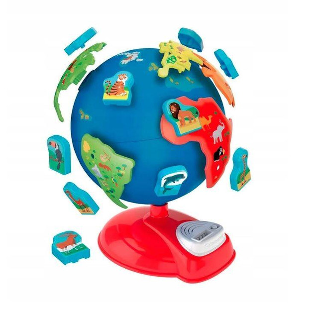 Duży elektroniczny globus z plastiku pochodzącego z recyklingu, z kontynentami i zwierzętami, które można połączyć, aby nauczyć się pierwszych pojęć z geografii.