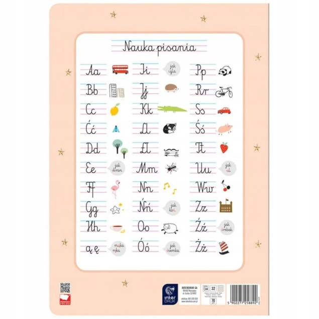 • Z tyłu okładki znajdują się pomoce edukacyjne, ułatwiające zapamiętanie polskiego alfabetu oraz poprawnej pisowni.