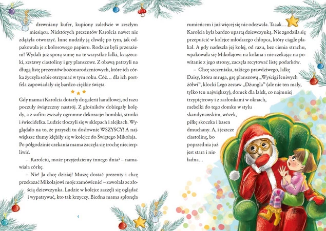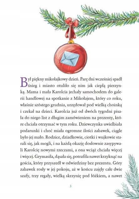No właśnie: dostawać, ale czy potrafiła się nimi cieszyć? A co z wdzięcznością za podarunki? Oto dziewczynka spotyka tajemniczego starszego pana z siwą brodą. Wygląda jak Mikołaj, ale przecież przed chwilą zamówiła już prezenty u Mikołaja w galerii handlowej! Dziwne, że ten staruszek tyle o niej wie... Czy Karolcia posłucha jego rad? I kto w tym roku zostanie obdarowany na święta?