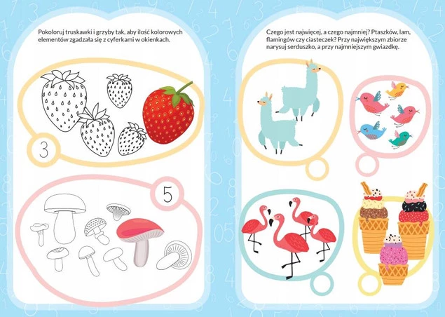 Barwna i urocza książeczka w przyjazny sposób zachęci do ćwiczeń, pokaże cyferki i wprawi rączkę do pięknego, poprawnego pisania. Wesołe kolorowanki i proste działania na obrazkach zaś staną się wspaniałą atrakcją i miłą rozgrzewką.