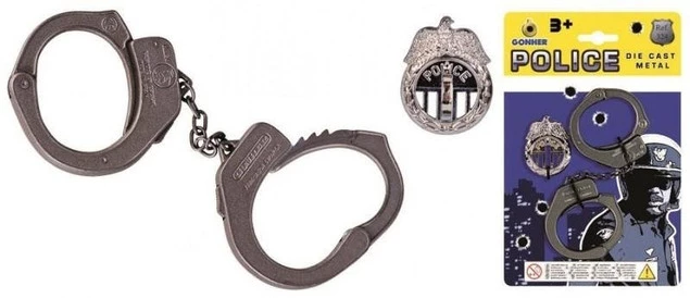 Zestaw zawiera metalowe kajdanki policyjne oraz plastikową odznakę.