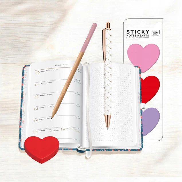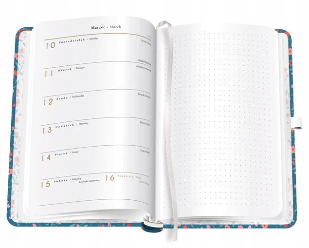 Kalendarz książkowy w formacie A5. 192 strony. Kalendarium: 1 tydzień na stronie oraz miejsce na notatki. Kartki w kropki do planowania i rysowania. Twarda oprawa. Okładka metaliczna lub matowa z lakierem wybiórczym. Kolorowa wyklejka. Gumka zamykająca, pętelka na długopis oraz tasiemka do zaznaczania strony.