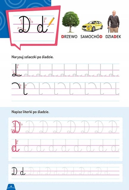 Książeczka krok po kroku uczy dziecko ładnego, czytelnego pisma. Każda strona poświęcona jest jednej literze – od prostych szlaczków nawiązujących kształtem do liter, po samodzielne pisanie. Strzałki przy wzorach pokazują kierunek prowadzenia długopisu, a przykłady słów z daną literą (na początku, w środku i na końcu wyrazu) oraz kolorowe ilustracje zachęcają do ćwiczeń.