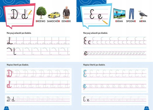 ✔Każda strona poświęcona jest jednej literce. Ćwiczenia rozpoczynają się od szlaczków, które pomyślane są w ten sposób, by rzeczywiście odwzorowywały jakiś fragment literki i przygotowywały rączkę do jej pisania - gwarantuje to, że korzystanie z nich jest przydatne. Następnie dziecko może poćwiczyć pisanie konkretnej literki - najpierw większej, a potem wielkości takiej, jak w szkolnych zeszytach. Strzałki we wzorze literki pokazują, jak należy poprawnie prowadzić długopis. Dodatkowo na każdej stronie dziecko znajdzie przykład występowania danej literki w słowach - na początku, na końcu i w środku, wraz z estetycznymi ilustracjami. Książeczka jest czytelna, przyjemna dla oka i zachęcająca malucha do ćwiczeń.