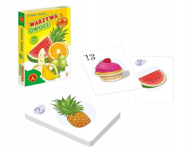 Zestaw 25 kart z obrazkami, dzięki którym można zagrać z dziećmi w dwie podstawowe gry karciane – „Piotruś” i „Pamięć”. Obie wspaniale ćwiczą spostrzegawczość, rozwijają skojarzenia oraz uczą zachowań społecznych. To idealny wstęp do świat gier dla najmłodszych. Zabawę umilą piękne ilustracje warzyw i owoców, które mogą stanowić przyczynek do rozmowy o zdrowym żywieniu.
