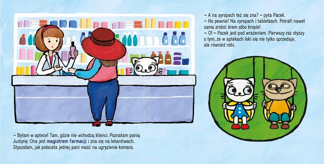 Tym razem Kicia Kocia spędziła cały dzień w aptece i opowiada Packowi, czego się dowiedziała. Pacek, Adelka, Julianek i Kicia Kocia bawią się teraz w aptekę – to bardzo ciekawa zabawa.