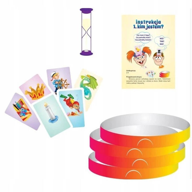 W zestawie znajduje się 110 kolorowych kart, 4 wygodne opaski do założenia na czoło, klepsydra odliczająca czas oraz instrukcja ułatwiająca szybkie rozpoczęcie gry. Wszystko wykonane jest z kartonu, a opakowanie ma wymiary około 22x19x5,5 cm. Gra posiada certyfikat CE potwierdzający bezpieczeństwo dla dzieci. Całość waży około 200 gramów, co sprawia, że gra jest lekka i wygodna do przenoszenia.