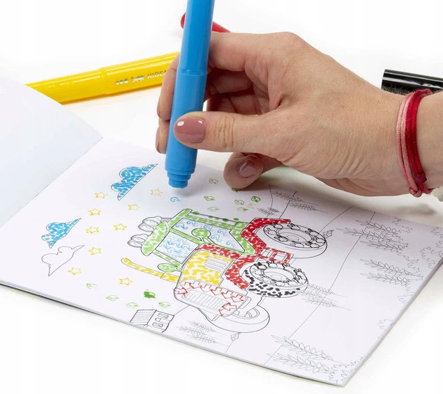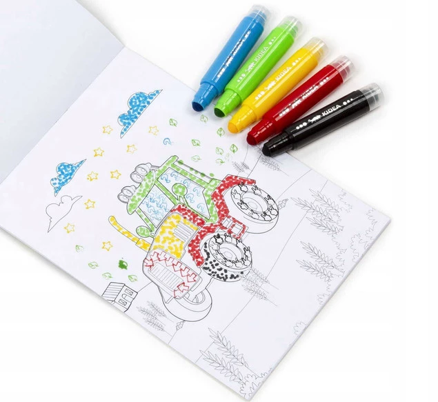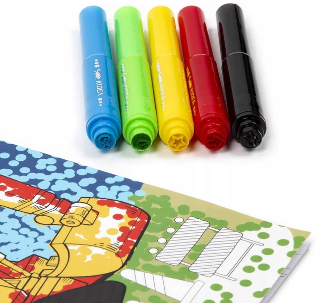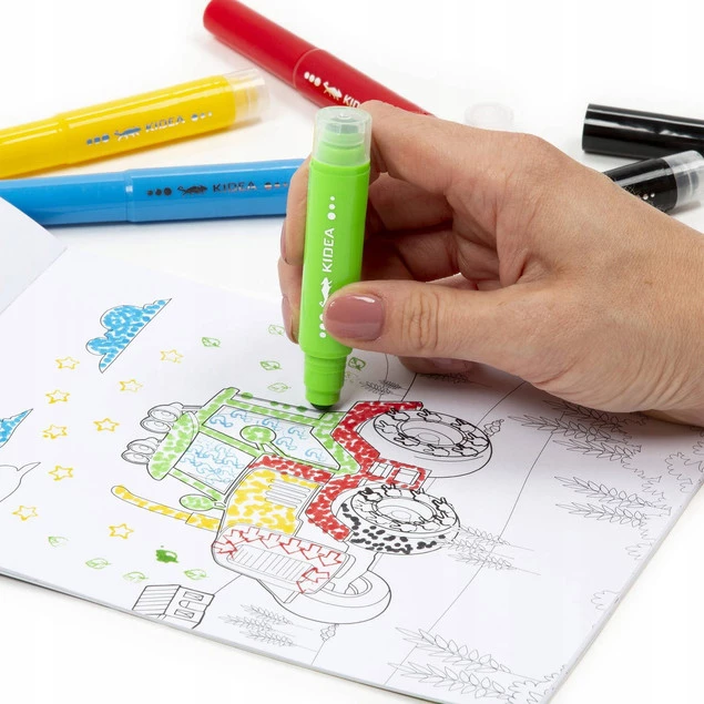 Zestaw Kidea zawiera kolorowankę z 10 arkuszami z obrazkami przeróżnych pojazdów oraz 5 kolorów dwustronnych flamastrów ze stempelkami: czerwony, zielony, niebieski, żółty i czarny.