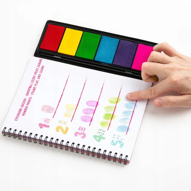 Książeczka z magicznymi wróżkami, słodkimi stworkami i krsnaludkami do malowania paluszkami. Wybierz wzór z książki, który chcesz wypełnić – możesz skorzystać ze stron edukacyjnyc, ucząc się liczyć, stworzyć bardzo łatwo zwierzaka przy pomocy odcisków palców albo pokolorować jeden z obrazków znajdujących się w środku. Dotknij gąbeczki z wybranym kolorem kilkukrotnie, możesz także przyłożyć palec do kilku gąbeczek, aby zmieszać ze sobą barwy i utworzyć nowe kolory. Przyciśnij paluszki w odpowiednich miejscach na arkuszu. Baw się eksperymentując z kolorami i różnymi odciskami. A może chcesz zabawić się w detektywa Ta wyjątkowa książeczka zawiera gąbeczki z kolorowymi tuszami, 21 kolorowanek oraz 8 kart edukacyjnych