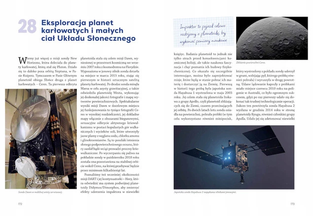 Kosmos pozostaje dla człowieka przestrzenią nadal tajemniczą. Dlatego tak bardzo ciekawią nas ogłaszane przez naukowców odkrycia. Dzięki nim stoimy u progu kolonizacji Księżyca, co ma być wstępem do załogowych lotów na Marsa. Książka opisuje wybrane osiągnięcia astronomii i astronautyki. Przedstawia m.in. technologie wynoszenia sond i sztucznych satelitów, obserwacje nowej generacji teleskopów i przebieg zautomatyzowanych misji w stronę planet i planetoid.