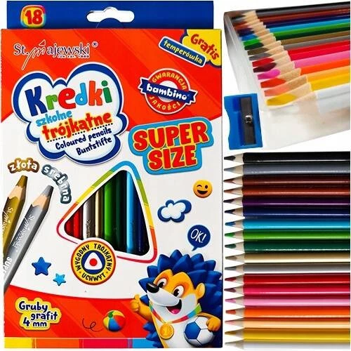Kredki Ołówkowe Trójkątne Szkolne Grube Grafity 18kol. + Temperówka Bambino
