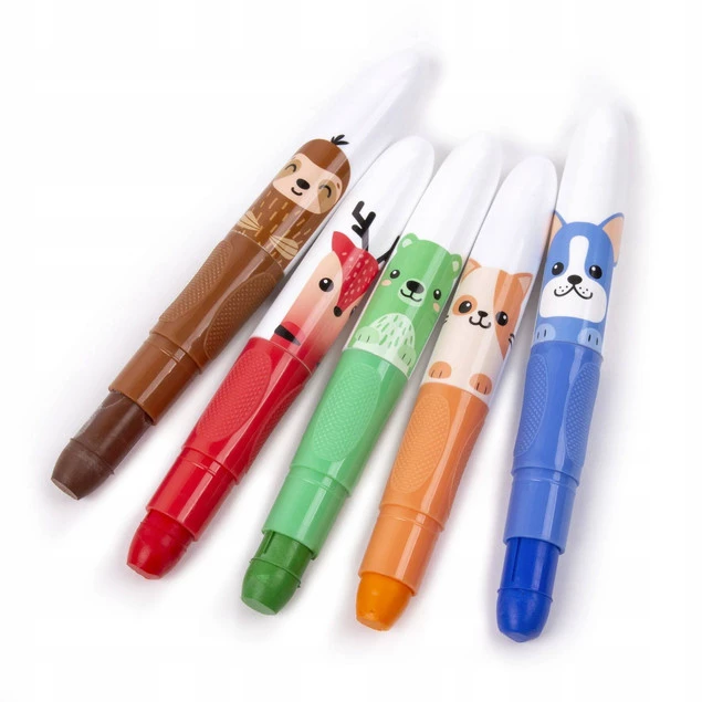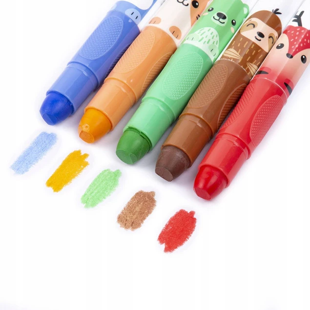 Kredki żelowe w 10 wyjątkowych odcieniach. Rysowanie nimi to czysta przyjemność, ruchy stają się takie płynne, a efekt gładki. Dodatkowym atutem są przemiłe zwierzaki, na każdej kredce inny wzór. Są bardzo wydajne, miękkie i doskonale kryją. Świetnie sprawdzają się w kolorowaniu dużych powierzchni. Nie wymagają temperowania – ich wkład wysuwa się za pomocą pokrętła. Idealne dla dzieci, które dopiero rozpoczynają przygodę z plastyką. Uwaga! Kolorowanie nimi jest naprawdę wciągające… !