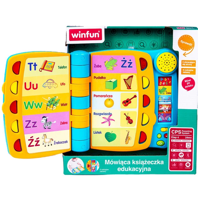 Książeczka Edukacyjna zainspiruje do poznawania liter cyfr wyrazów kształtów odgłosów i godzin. Dzieci przerzucając kolejne strony mogą naciskać guziki decydując jakie nowe słowa chcą poznać. Pięć różnych trybów zabawy oraz przyjazna grafika zachęci do zdobywania nowej wiedzy oraz utrwalania wiadomości. Zabawka pozwala dziecku zdecydować o intensywności i rodzaju zabawy zgodnym z wiekiem oraz zainteresowaniami malucha.