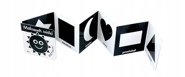 Książeczka harmonijka to propozycja dla najmłodszych dzieci, które wyraźnie widzą tylko kontrastowe barwy. Niemowlęta najpierw rozróżniają kolory czarny i biały. Książeczka stopniowo wprowadza malucha w świat kształtów.