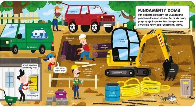 Z książką „Na budowie” dzieci prześledzą wszystkie kluczowe i najciekawsze etapy budowy domu. Poznają nazwy sprzętów budowlanych oraz nazwy i sposób funkcjonowania maszyn i pojazdów pracujących na placu budowy. Dowiedzą się, kto pracuje przy pierwszym etapie powstawania domu, a kto przy jego wykończeniu. Książeczki z okienkami otwierają dziecięce umysły na świat. Polecamy je wszystkim maluchom!