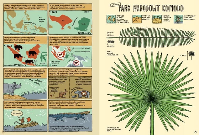 Aleksandra i Daniel Mizielińscy są mistrzami przekazywania wiedzy w przystępny i atrakcyjny sposób. Tym razem ogrom informacji o dzikiej przyrodzie różnych kontynentów zawarli w dowcipnym i wciągającym komiksie, który płynnie przenika się z efektownymi planszami edukacyjnymi.
