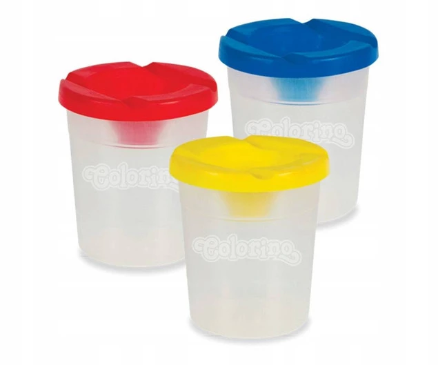 Kubeczek do płukania pędzli. Posiada specjalną pokrywkę z blokadą wylania, która uniemożliwia wylanie wody w przypadku przewrócenia się kubeczka. Kolorowa pokrywka z dwoma miejscami na odłożenie pędzelków.