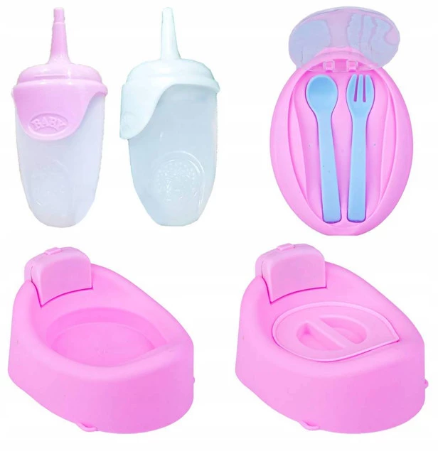 W zestawie nocnik z modułem dźwiękowym. Wystarczy nacisnąć guzik, aby usłyszeć dźwięki. Ponadto do zestawu dołączono talerzyk, butelkę, sztućce w pojemniku - łyżeczka i widelczyk.