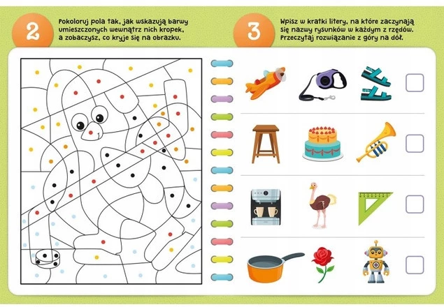 W tej starannie opracowanej graficznie książce znalazły się dostosowane do możliwości 5-latka przemyślane, kolorowe i urozmaicone zadania. Są tu krzyżówki obrazkowe i labirynty. Są łączenia punktów i ukryte obrazki do pokolorowania. Są rebusy, szyfrogramy, zagadki, sudoku oraz inne łamigłówki. Dzięki nim dziecko potrenuje logiczne myślenie, utrwali znajomość liter, rozwinie umiejętności liczenia, porządkowania, porównywania cech i wielkości, rozróżniania kształtów i kierunków. To również doskonała okazja, by poćwiczyło koncentrację, cierpliwość i staranność. A przy tym wszystkim – rozwiązywanie łamigłówek to przecież wspaniała, lubiana przez dzieci, satysfakcjonująca zabawa!