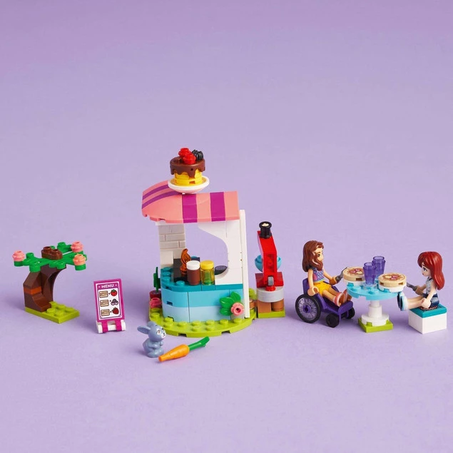 Akcesoria do naleśników — zestaw LEGO® Friends zawiera menu, dwa naleśniki, czekoladę, słoiczki z miodem, dwa widelce, dwa kubki, gaśnicę i mikser.