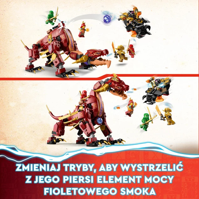 Dzięki zestawowi Lawowy smok zmieniający się w falę ognia (71793) fani ninja w wieku od ośmiu lat mogą odtwarzać swoje ulubione sceny z serialu telewizyjnego NINJAGO® Dragons Rising. Zawiera on niespotykanego dotąd smoka, którym dzieci mogą bawić się na dwa sposoby. W trybie pokojowym stoi majestatycznie, ale po odwróceniu do góry nogami przełącza się w tryb bojowy, który pozwala mu wystrzelić z piersi element mocy fioletowego smoka.