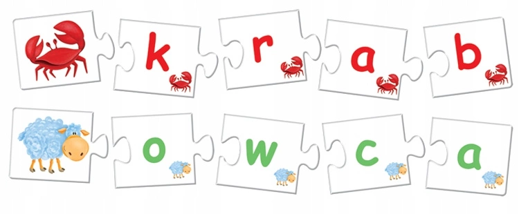 Zadaniem dziecka jest odnalezienie pięciu puzzli tworzących komplet (na który składa się obrazek oraz cztery litery w jednym kolorze) oraz ułożenie ich we właściwej kolejności. Ta prosta układanka edukacyjna sprawi, że pierwsze próby czytania będą dla dziecka świetną zabawą!