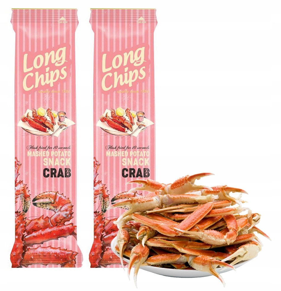 Long Chips Crab to wyjątkowe przekąski ziemniaczane. Smażone w wysokiej jakości oleju rzepakowym tylko przez 10 sekund, przez co są niesamowicie chrupkie i nie są tak tłuste jak klasyczne chipsy. Long Chips mają oryginalny kształt - są długie, płaskie i bardzo cienkie. Umieszczone w tacce, aby nie uległy zniszczeniu. Są dostępne w starannie dobranych smakach.