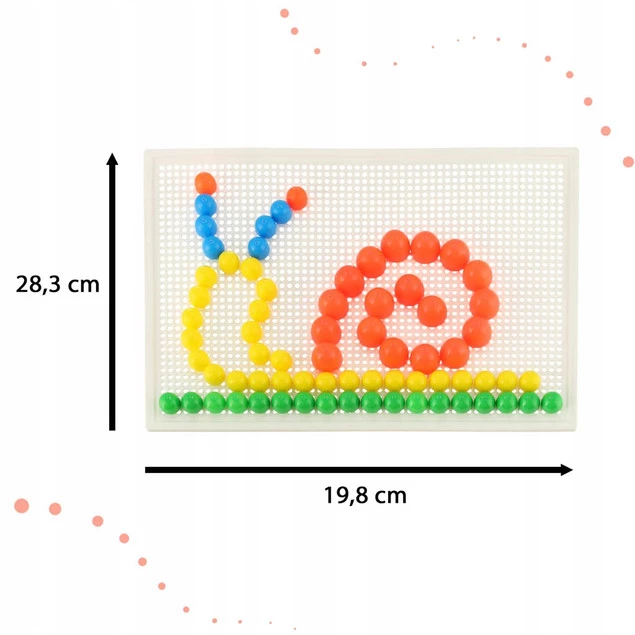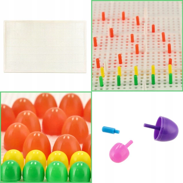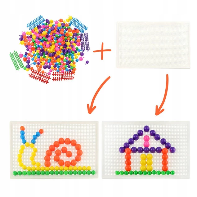 Kreatywna zabawka edukacyjna pozwalająca tworzyć niemal nieskończoną ilość fantazyjnych obrazków. W jej skład wchodzi plastikowa tablica z otworami (28,3 x 19,8 cm) oraz 600 wpinek (w 7 kolorach oraz 3 wielkościach). Do zestawu dołączony jest album zawierający ponad 100 inspiracji. Zabawka ćwiczy kreatywność i wyobraźnię.