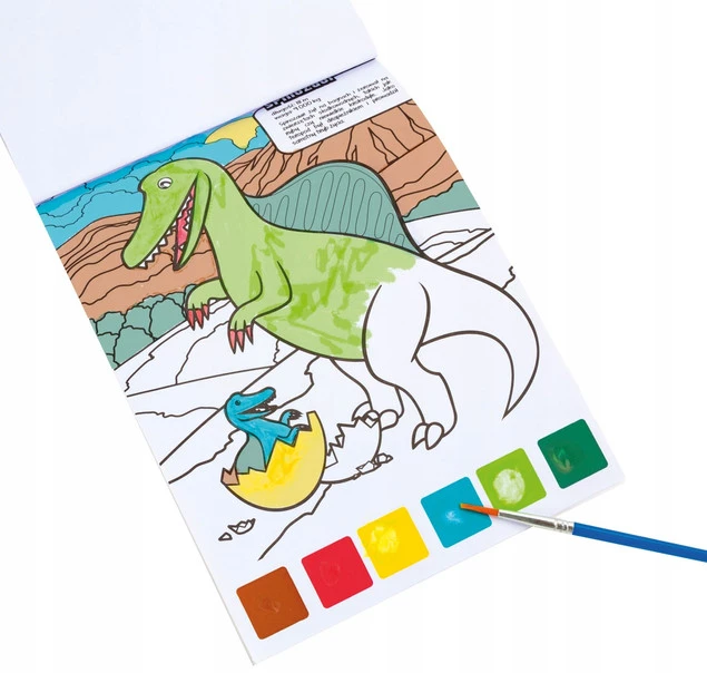 Wewnątrz znajdziesz aż 10 arkuszy do pomalowania z różnymi gatunkami dinozaurów!