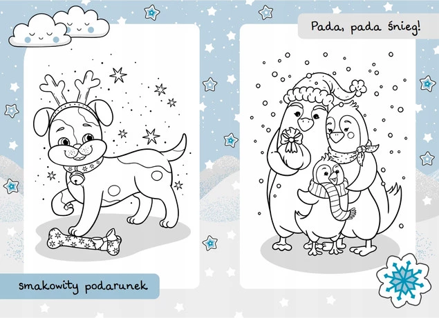 W tym zeszycie znajdziecie zimowe malowanki – pełne szczegółów i różnorodnych kształtów kompozycje do kolorowania. Wystarczy dobrać do nich odpowiednie barwy, by powstały obrazki przepełnione magią świąt. Mikołaj z pewnością doceni dzieła młodych artystów!