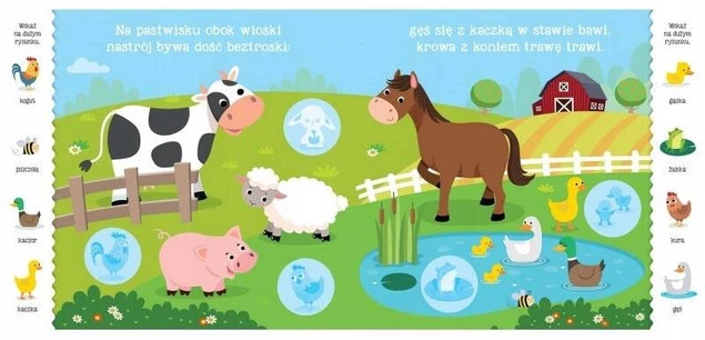 to starannie opracowana aktywizująca książka z dużymi naklejkami. Bawiąc się nią, dziecko: