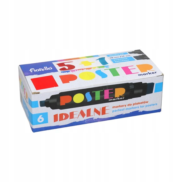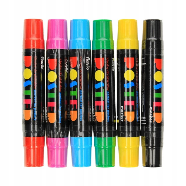 Zestaw dwustronnych markerów plakatowych GR1712 marki Fiorello. Doskonałe narzędzie do tworzenia plakatów, transparentów, szyldów itp. Markery są bardzo szerokie, a w dodatku dwustronne: jedna zostawia ślad o szerokości aż 10 mm (i to jest ta węższa!), a druga aż 17 mm, przez co rysowanie tytułów plakatów czy nawet dużych form graficznych będzie błyskawiczne. Markery są wodoodporne, szybkoschnące i wystarczają na dłuuuugo!