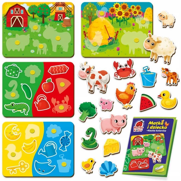 Edukacyjna gra z rzepami Matka i dziecko? to ciekawa forma zabawy połączona z nauką kolorów, która w komplecie zawiera zestaw plansz oraz elementów - postacie zwierząt, roślin i przedmiotów oraz odpowiadające im kolory.