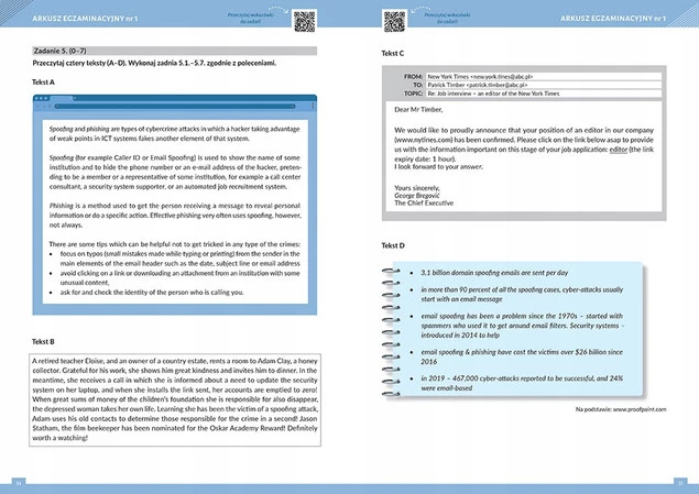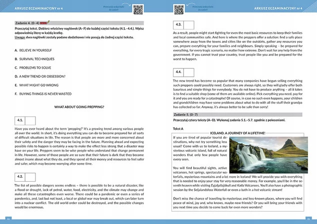 Ponadto, po zeskanowaniu kodów QR, uzyskasz dostęp do dodatkowych materiałów, takich jak nagrania i transkrypcje, klucz rozwiązań do każdego arkusza. Arkusze przygotowane przez doświadczonych nauczycieli języka angielskiego, związanych z Wydawnictwem GREG, to nieoceniona pomoc w przygotowaniach do egzaminu maturalnego.