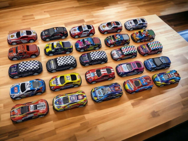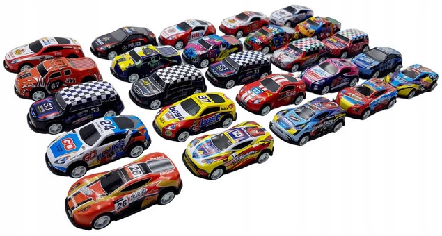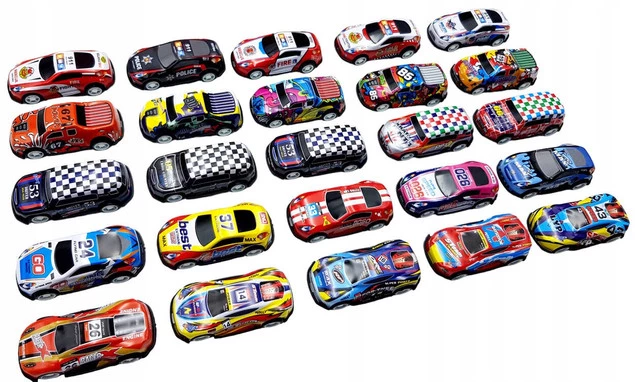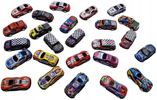 W zestawie znajdują się samochodziki w różnych kolorach i wzorach.