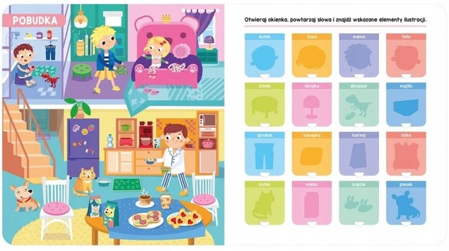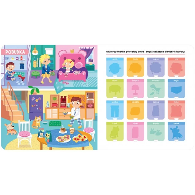 "Książeczka z okienkami. Mój dzień" to wyszukiwanka, z którą maluszek pozna i utrwali pierwsze słowa.