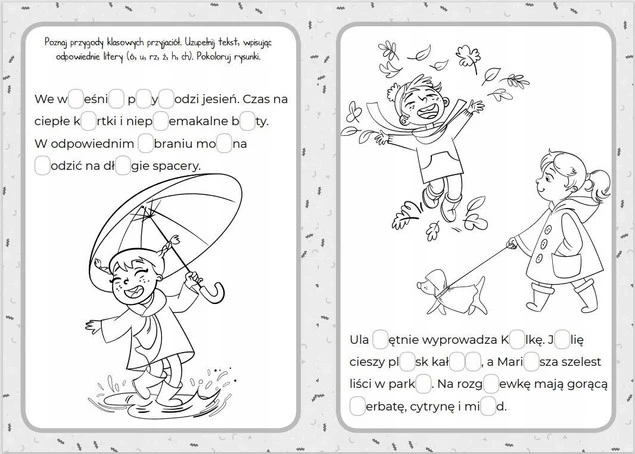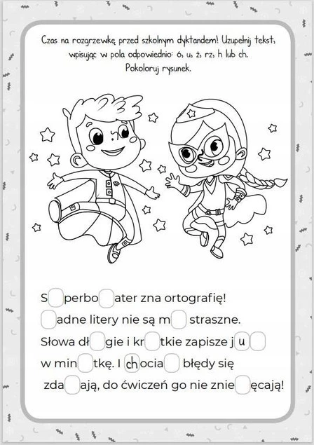 Wyzwanie dla ortograficznego superbohatera! Przygody szkolnych przyjaciół to znane dziecku sytuacje i codzienne słownictwo. Zestaw krótkich tekstów do uzupełniania pomoże mu ćwiczyć pisownię wyrazów z ó, u, ż, rz oraz h, ch, zaś sympatyczne rysunki do kolorowania zapewnią rozrywkę po dzielnym wykonaniu zadania. Świetna rozgrzewka przed klasowym dyktandem!