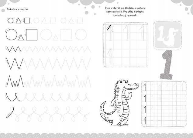 Pisz cyferki po śladzie, zgodnie ze wskazówkami, a potem samodzielnie. Policz rozbrykane zwierzątka i rozwiąż ciekawe zadania z ich udziałem. Koloruj, odszukuj i naklejaj!